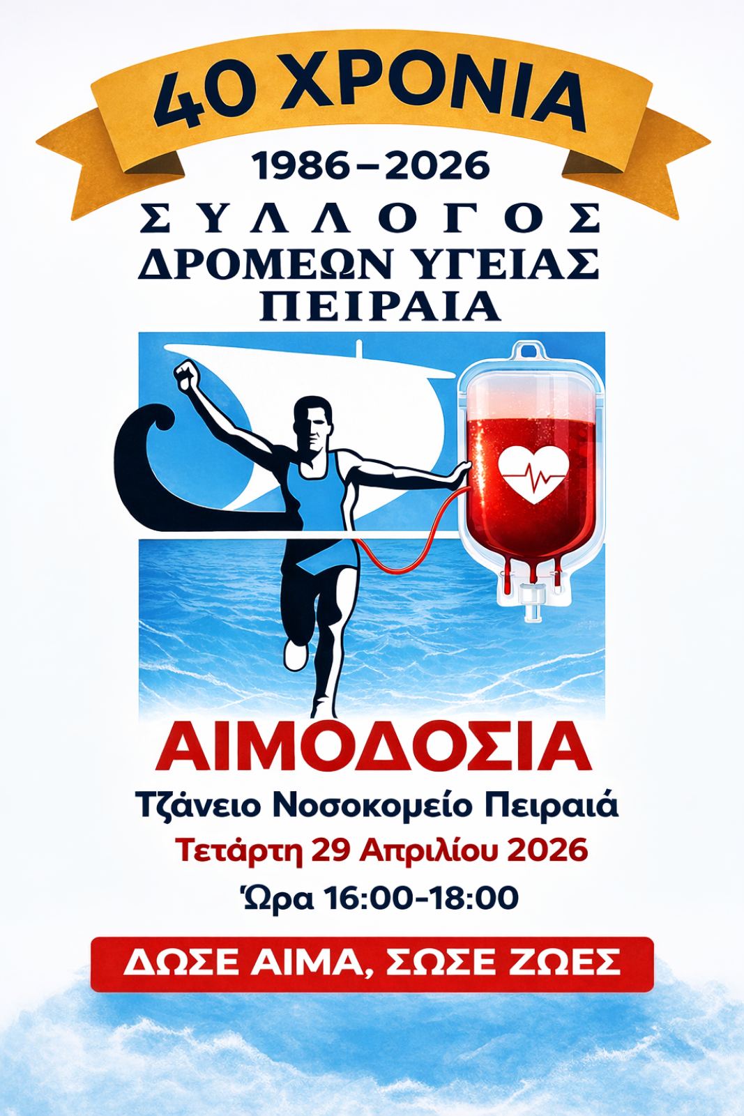 Η δράση θα γίνει την 29 Απριλίου 2026 από τις 04.00μμ έως τις 06.00μμ. στοΤμήμα Αιμοδοσία του Τζανείου Νοσοκομείου Πειραιά.